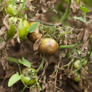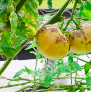 The first signs of early blight appear as small, circular or irregular dark brown to black spots with concentric rings that form a ‘bulls’ eye’ pattern on the lower leaves. As the disease progresses it spreads outward on the leaf surface causing it to turn yellow, wither and die. This disease is common in tomato and potato plants. This fungal disease can remain in the soil and can be spread by splashing rain, irrigation, insects and garden tools. Wet and humid conditions accompanied by high temperatures promote its rapid spread. Symptoms of early blight can occur on the foliage, fruit and stem at any stage of development.