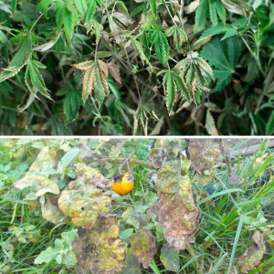 Just like early blight, late blight is also a fungal disease. However, each disease is caused by a different type of fungus. Late blight is also very common on tomatoes and potatoes. The first symptoms are irregularly shaped, water-soaked lesions often with a lighter ring around them. These lesions are typically found on the younger leaves in the top portion of the plant. During high humidity, white cottony growth may be visible on both sides of the leaves. Spots are visible on both sides of the leaves. As the disease matures lesions enlarge causing leaves to brown, shrivel and die.