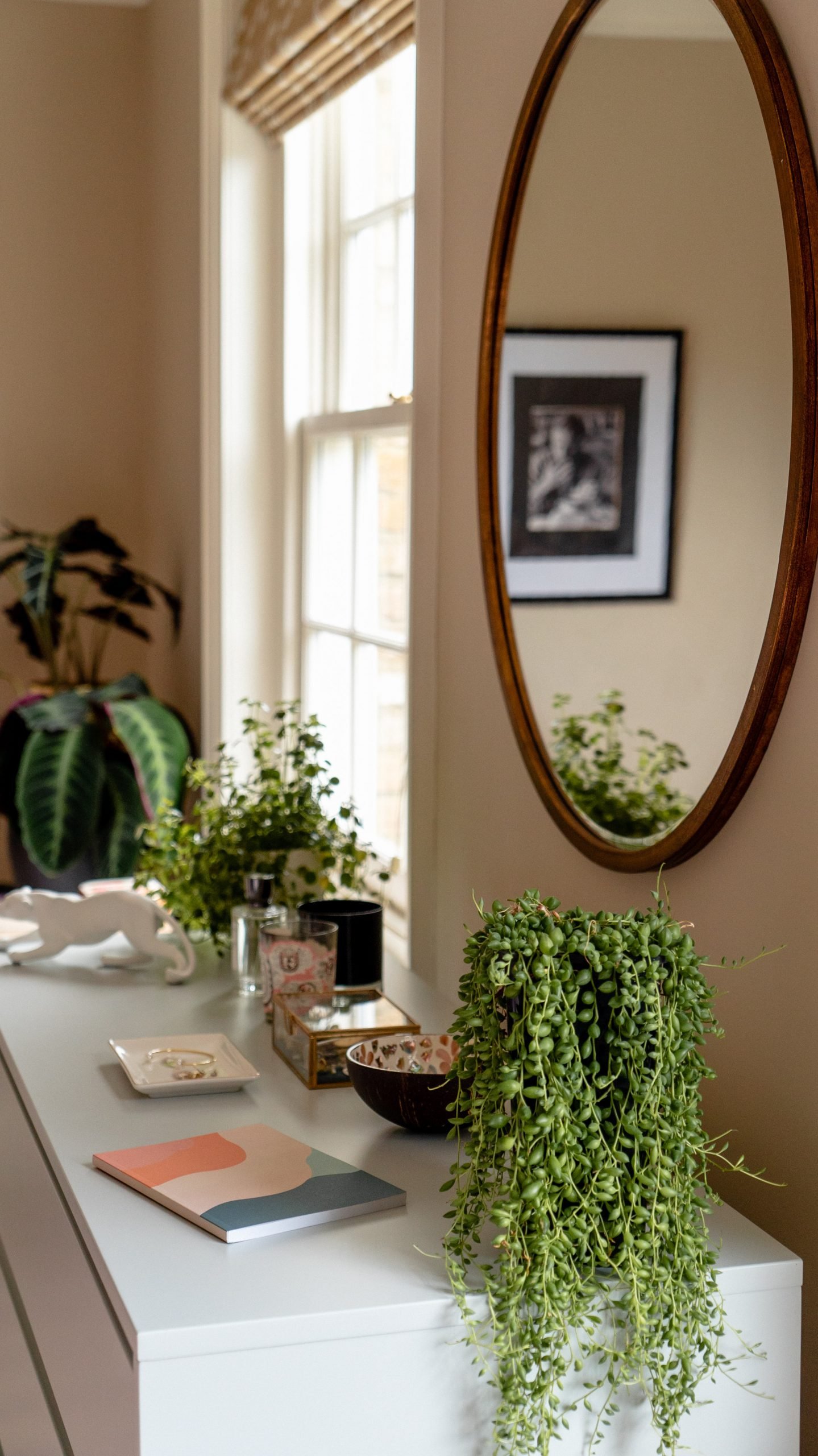 Delicate plants for your delicates. String of pearls or trailing ivy would make great companions for your delicate items.